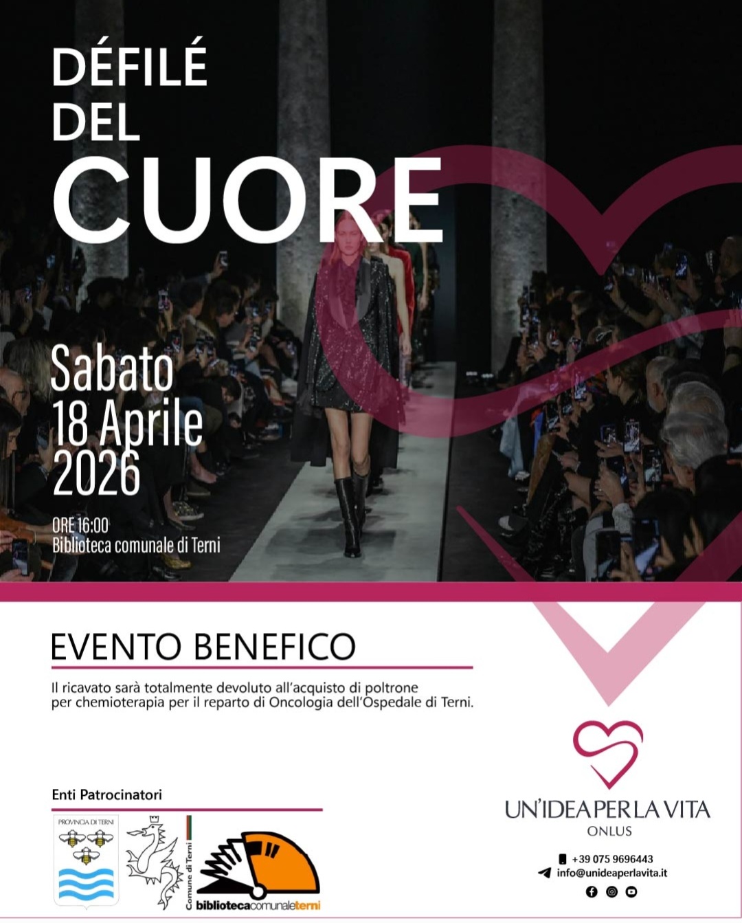La moda incontra la solidarietà per il Défilé del cuore che Un’idea per la vita onlus ha organizzato sabato 18 aprile alle 16 nella Biblioteca comunale di Terni. L’associazione presieduta da Laura Cartocci darà vita, infatti, a un evento benefico di raccolta fondi per l’acquisto di poltrone omologate per la somministrazione di chemioterapia e destinate al reparto di Oncologia dell’Ospedale ‘Santa Maria’ di Terni. Nella suggestiva location ternana, luogo di cultura e letteratura, sfileranno le  modelle del cuore, ma anche alcune professioniste, con l’obiettivo di sensibilizzare rispetto alle attività dell’associazione a sostegno alle pazienti oncologiche nel loro percorso di cura.