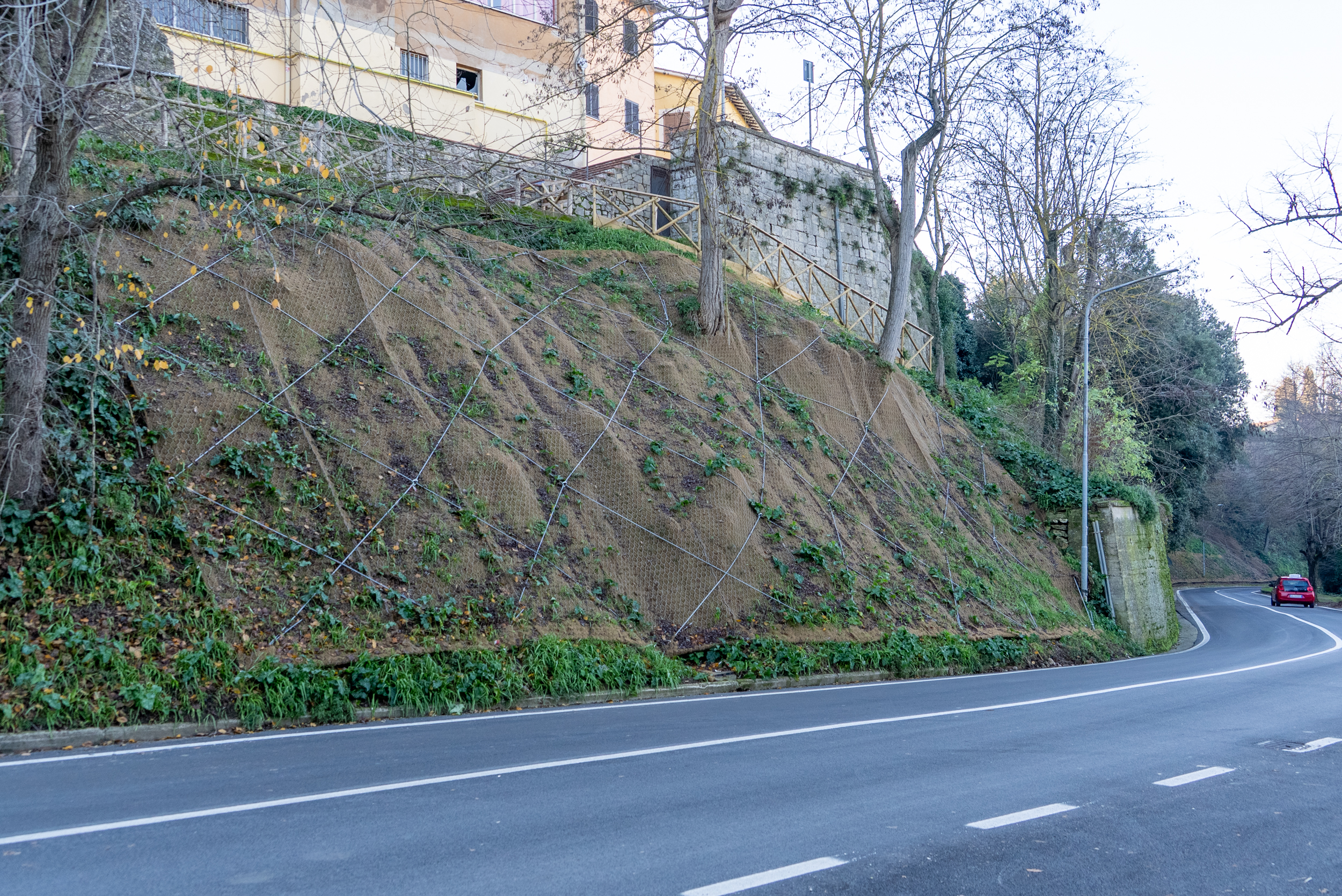 I cantieri hanno interessato i versanti di Via della Circonvallazione e quelle nella zona di Borgo Garibaldi, con la realizzazione di due muri di contenimento e la stesura di geogriglie di rinforzo e consolidamento delle pendici e con un’attenta regimentazione, raccolta e smaltimento delle acque meteoriche tramite gli scarichi fognari.