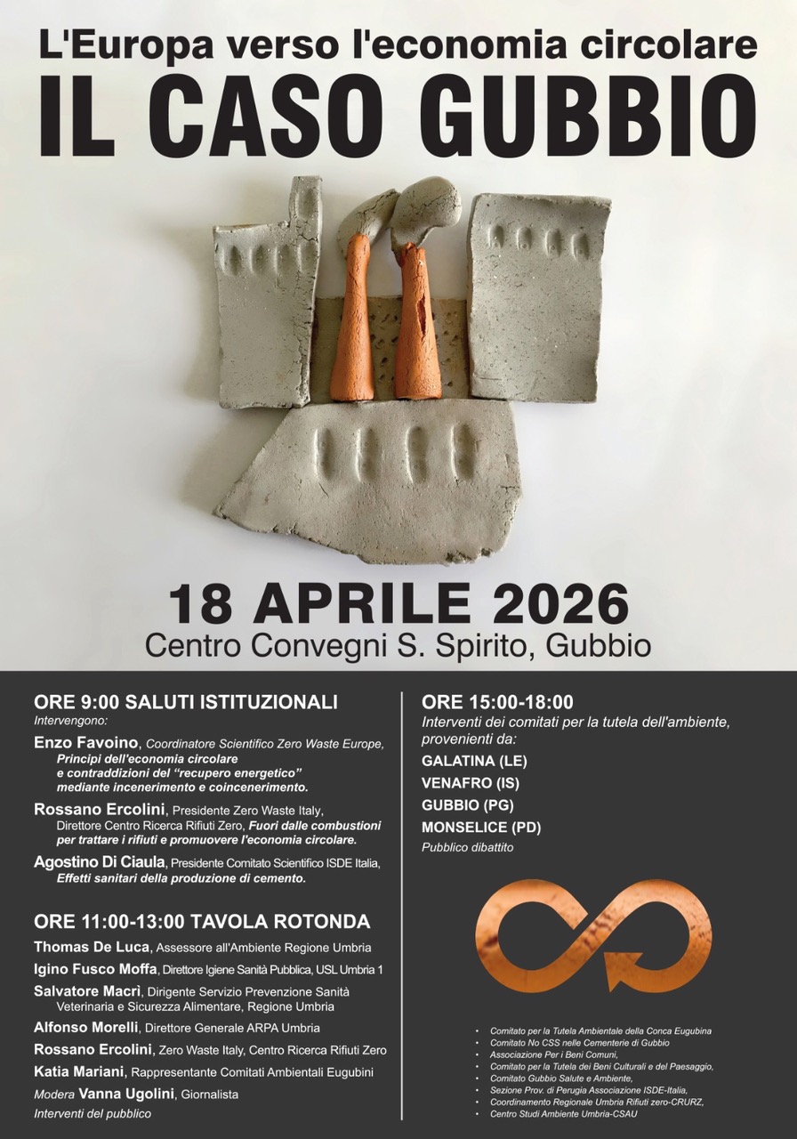 Sabato 18 aprile, presso il Centro Servizi Santo Spirito di Gubbio si svolgerà dalle ore 9, e per l’intera giornata, il convegno: L’Europa verso l’economia circolare: il caso Gubbio. L’incontro inizierà con le relazioni di: Enzo Favoino (Coordinatore Scientifico di Zero Waste Europe), Rossano Ercolini (Presidente Zero Waste Italy e Direttore Centro Ricerche Rifiuti Zero) e Agostino Di Ciaula (Segretario Scientifico e Presidente Comitato Scientifico International Society of Doctors Environment – ISDE Italia).