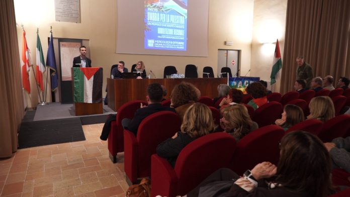 Si è tenuto mercoledì 8 ottobre a Palazzo Trinci di Foligno, l’incontro regionale ‘Umbria per la Palestina – Comunità locali e istituzioni insieme per aiutare un popolo che esiste e resiste’, nuova tappa del percorso di mobilitazione avviato dopo la firma del Patto dell’Umbria per la Palestina lo scorso 29 settembre a Terni. Presieduto da Sara Tiberi, in rappresentanza del Comitato di Foligno per la Palestina e delle forze che hanno organizzato le manifestazioni in città, l’incontro ha visto la partecipazione di numerosi amministratori locali, consiglieri regionali e comunali, oltre ai segretari e coordinatori dei partiti e movimenti firmatari del Patto Umbria per la Palestina. In particolare, sono intervenuti Damiano Bernardini, segretario regionale del Partito Democratico; Enrico Brugnoli, neo presidente di Umbria Domani; Fabrizio Ricci, capogruppo di Alleanza Verdi e Sinistra in Consiglio regionale; Andrea Sisti, sindaco di Spoleto e segretario dei Civici Umbri; Antonio Donato, consigliere comunale di Perugia per il Movimento 5 Stelle; Simone Taccucci del Partito Socialista Italiano; Sandro Pasquali, sindaco di Passignano sul Trasimeno e capofila del progetto di cooperazione Land; Maria Laura Baldoni per Umbria per la Sanità Pubblica e, in chiusura, Vittoria Ferdinandi, sindaca di Perugia.