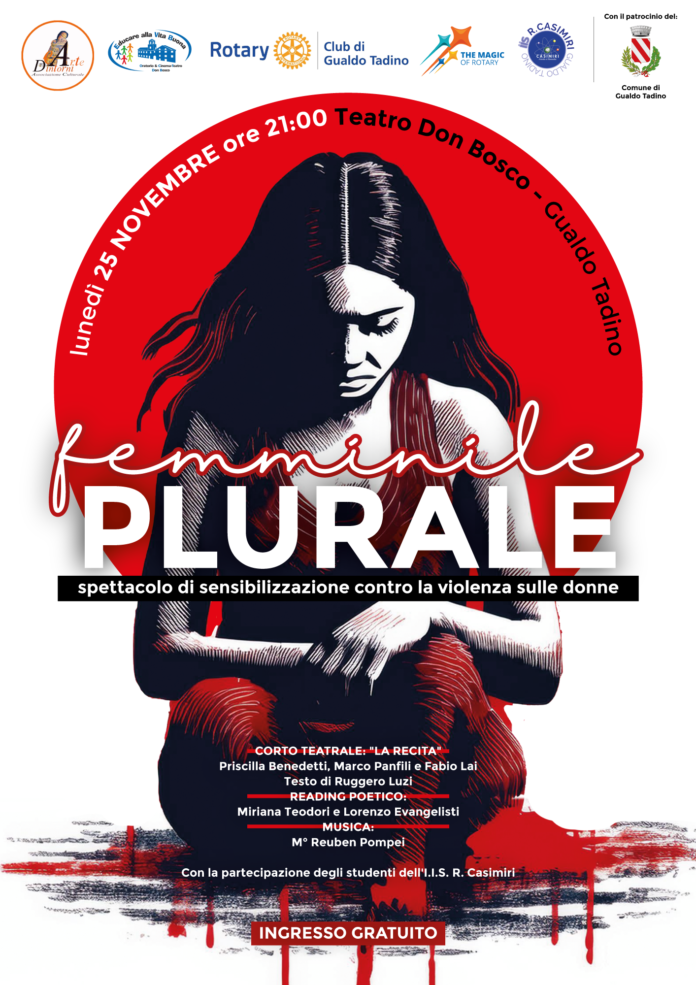 In occasione della Giornata Internazionale, infine, contro la Violenza sulle Donne, lunedì 25 aprile alle ore 21 le associazioni Arte & Dintorni, Educare alla Vita Buona e l’Istituto d’istruzione superiore Casimiri presentano “Femminile plurale”, uno spettacolo di teatro, musica e poesia realizzato grazie al sostegno del Rotary Club Gualdo Tadino. Ingresso libero.