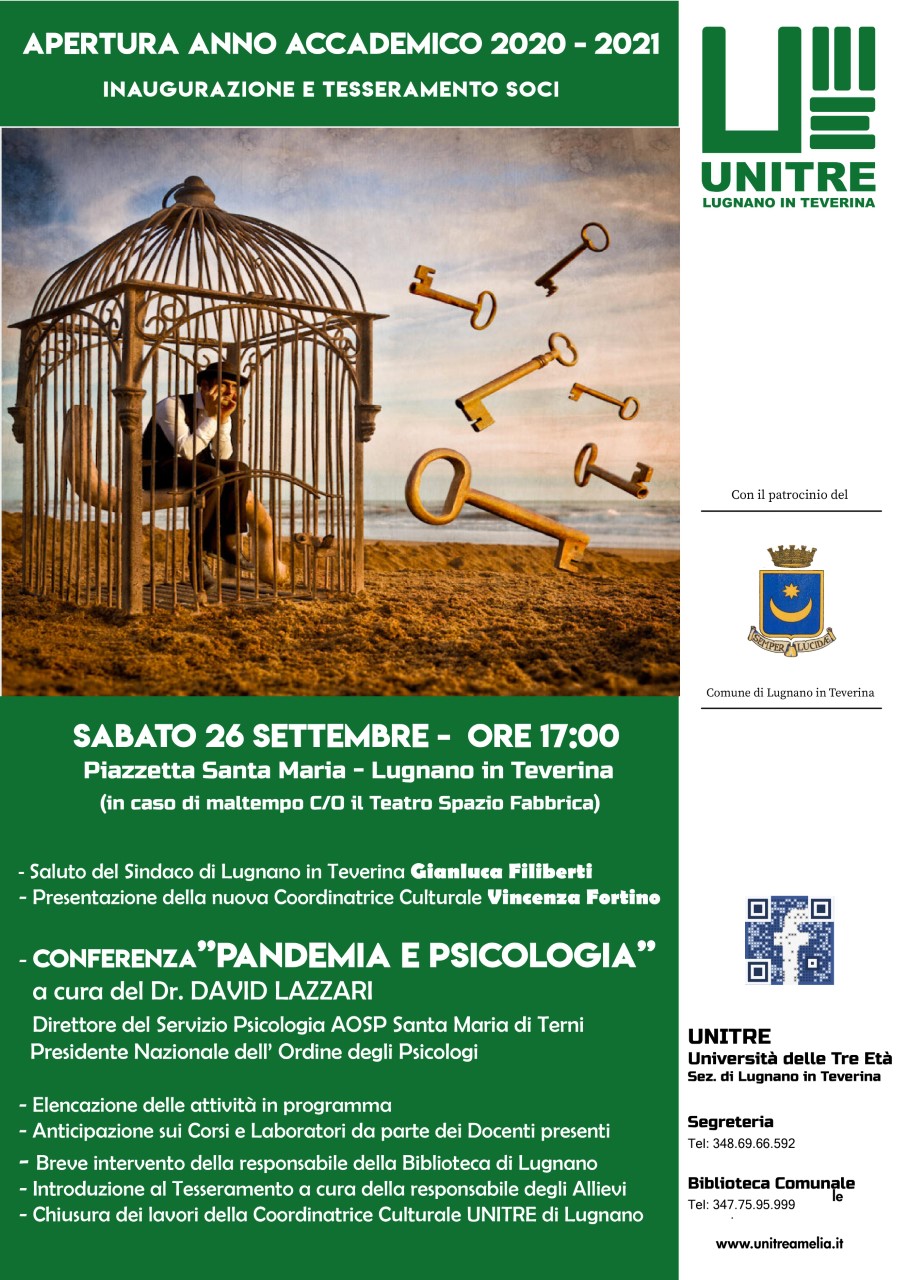 Sabato 26 settembre, alle 17, nella piazzetta Santa Maria, si inaugura l’anno accademico 2020/21 e si apre la campagna tesseramento dell’Unitre di Lugnano in Teverina.