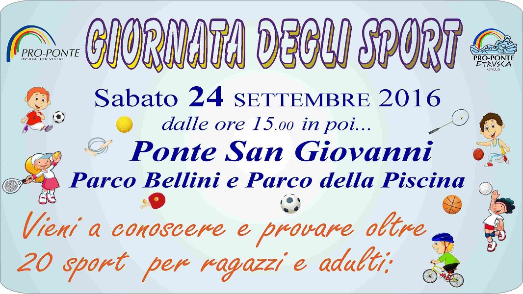 La prima edizione si è svolta nel mese di giugno con la partecipazione di oltre 500 giovani delle scuole di Ponte San Giovanni e dei paesi vicini, la seconda “Giornata degli Sport” si svolgerà sabato 24 settembre dalle 15.00 in poi tra il Parco Bellini e il Parco della Piscina adiacente a via della Scuola con l’organizzazione della Pro Ponte, l’associazione che ha per motto “insieme per vivere” e quindi anche per fare sport. Ventiquattro le associazioni sportive che hanno dato la loro adesione per assistere e coordinare i partecipanti alle varie attività. Pallavolo, pallacanestro, atletica, calcio, arrampicata, calcio balilla umano, judo, karate, ciclismo, orienteering, tchoukball, tiro con l’arco, bocce, pattinaggio,pugilato, autodifesa, tennis tavolo, ginnastica artistica, nordic walking sono alcune delle specialità cui si potranno iscrivere liberamente giovani, e adulti. Società gloriose in ambito sportivo come la Fortebraccio, la Basket Accademy, il CSAIN, la Pontevecchio, Passi di Salute, Bocciofila città di Perugia, Skating Club, CAI, CSI, Boxe Umbria, Promos, Sport Connection hanno aderito con entusiasmo all’invito del presidente Palmerini a ripetere questa iniziativa che in giugno riscosse notevole successo, anche di pubblico ad assistere alle varie esibizioni. E’ una utile promozione dello sport a livello amatoriale e che potrebbe indirizzare ai vari sport futuri campioni. Nello Street Food allestito negli spazi sportivi si potranno degustare alcune specialità gastronomiche: pesce fritto (Coop pescatori), bomboloni (Pasticceria Alunni), zucchero filato (Italfood) e inoltre porchetta, arrosticini, arvoltoli dolci e salati.