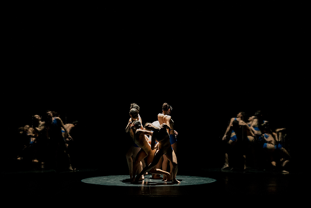 Sul palco il suono del respiro dei primi uomini, che nel buio della notte dei tempi muovono i loro passi primitivi e rudi e si immergono giocosi nelle acque fertili, fonte di sostentamento. Il blu acquisisce significato di purificazione e iniziazione religiosa ma acqua non è solo elemento sacro ma anche riflesso dei nostri vizi, della nostra vanità che ci porta a perire così come nel mito di Narciso. L’acqua è forza distruttrice, emblema della natura che incombe sull’uomo. Un viaggio illusionistico che ci permetterà di riflettere sul significato, sul simbolismo e sull’importanza dell’acqua, ampliando quel senso di responsabilità che l’umanità ha verso la Natura.