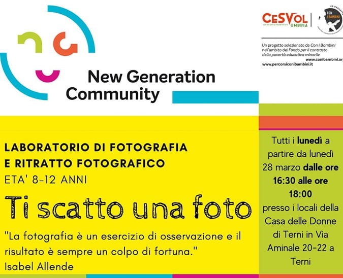 E’ quanto propongono a ragazzi e ragazze i due laboratori che, collegati alla mostra PandemicA, racconto corale fatto di fotografie e testi autobiografici, sono stati organizzati dall’associazione Terni Donne nell’ambito del progetto “New Generation Community”, coordinato dal Cesvol Umbria, sede di Terni e selezionato da Con i Bambini nell’ambito del Fondo per il contrasto della povertà educativa minorile.