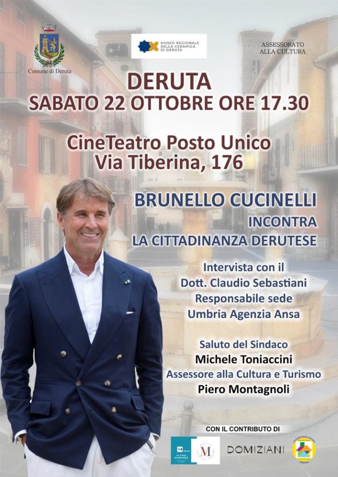 Brunello Cucinelli incontra i derutesi. L’appuntamento è per sabato 22 ottobre, alle ore 17,30, quando il re del cashmere sarà intervistato dal responsabile Ansa Umbria, Claudio Sebastiani, in un incontro pubblico che si terrà al CineTeatro Posto Unico di via Tiberina.