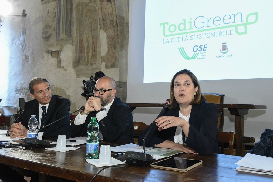 La due giorni degli “Stati Generali dell’Energia” ospitati a Todi sabato 6 e domenica 7 maggio apre prospettive di medio-lungo periodo e di notevole importanza per la città sul tema della sostenibilità, uno degli aspetti che domineranno la scena delle scelte nei prossimi anni. Nuovi investimenti e sperimentazioni potranno riguardare direttamente Todi, con la sua qualità di vita ed il suo futuro. L’evento, voluto dall’Amministrazione comunale, con il supporto di GSE, la società che promuove e sostiene le fonti rinnovabili e l’efficienza energetica in Italia, ha visto la partecipazione ed il coinvolgimento di istituzioni, imprese, scuole, professionisti ed operatori di settore impegnati in incontri e tavoli di lavoro tematici dedicati alla sostenibilità come opportunità di sviluppo e volano di crescita del territorio. Il GSE si è impegnato ad essere presente a Todi con uno sportello, in via sperimentale, ogni due settimane per supportare cittadini e imprese su questioni relative ai propri impianti e alle proprie convenzioni con il GSE, oltre a fornire assistenza generale sulle tematiche legate alle fonti rinnovabili. “Todi ha dato dimostrazione che si può accedere ai contributi del GSE non in modo facile, ma impegnandosi in progetti di efficienza e riqualificazione”, ha detto il Presidente del GSE, Francesco Sperandini, sottolineando come in due mesi il GSE abbia riconosciuto “incentivi importanti per una città come Todi”. Il Comune di Todi, infatti, ha già inviato le richieste di contributo al GSE ed alla Regione Umbria con 9 nuovi interventi per l’efficientamento energetico di edifici pubblici e scolastici per un investimento complessivo di oltre un milione di euro. Gli interventi, che saranno finanziati tramite lo specifico bando regionale, gli incentivi del Conto Termico del GSE e risorse comunali, interessano Palazzo dei Priori, Palazzo del Capitano del Popolo, gli Uffici comunali di Piazza di Marte, la scuola Aosta, la scuola media Cocchi, la scuola elementare di Porta Fratta, la scuola elementare di Ponterio, la scuola materna Pian di San Martino e la scuola materna di Pian di Porto. Si tratta di interventi finalizzati alla riduzione dei consumi elettrici e termici attraverso l’utilizzo di tecnologie a basso consumo e ad alta efficienza per una miglior fruibilità ed un maggiore comfort degli edifici interessati, un maggiore risparmio economico sulla spesa energetica, oltre ai maggiori vantaggi ambientali in valore assoluto quali risparmio di energia primaria e diminuzione di emissioni di CO2
