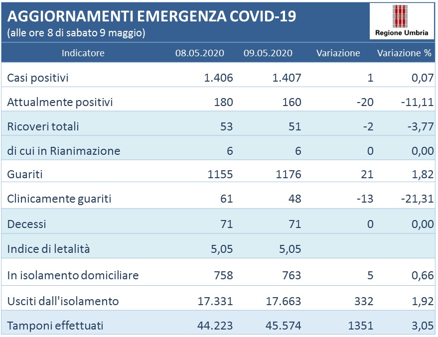 Questi i dati al momento disponibili e aggiornati alle ore 8 di sabato 9 maggio: complessivamente 1.407 persone (+1 rispetto a ieri) in Umbria sono risultate positive al virus Covid-19, gli attualmente positivi sono 160(-20).