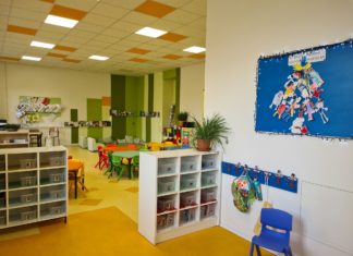 Colori delle aule diversi a seconda delle attività ospitate; orto didattico nello spazio esterno; refettorio...