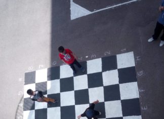 Il cortile riqualificato e la scacchiera gigante che rendono i bambini protagonisti