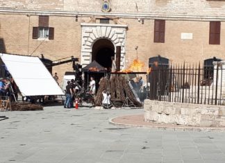 Centro storico di Perugia trasformato in set, con tanto di rogo allestito tra la fontana Maggiore...