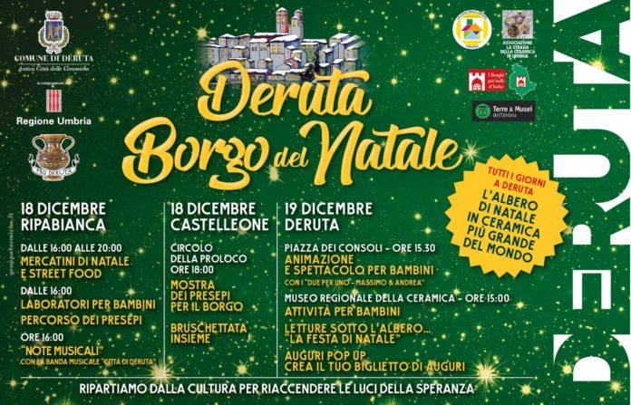 Domani sabato 18 a Ripabianca dalle 18 alle 20, mercatini di Natale e street food, alle 16 laboratorio per bambini e vista del percorso presepi. A rallegrare il pomeriggio pre natalizio anche la Banda Musicale Città di Deruta. Nello stesso giorno, a Castelleone si terrà la mostra dei presepi nel borgo e ai visitatori sarà offerta una bruschetta per stare insieme. Domenica 19 dicembre a Deruta in piazza dei Consoli, a partire dalle 15,30, animazione per bambini a cura di Massimo e Andrea e letture sotto l’albero, inoltre, sarà possibile creare il proprio biglietto di auguri in pop up.