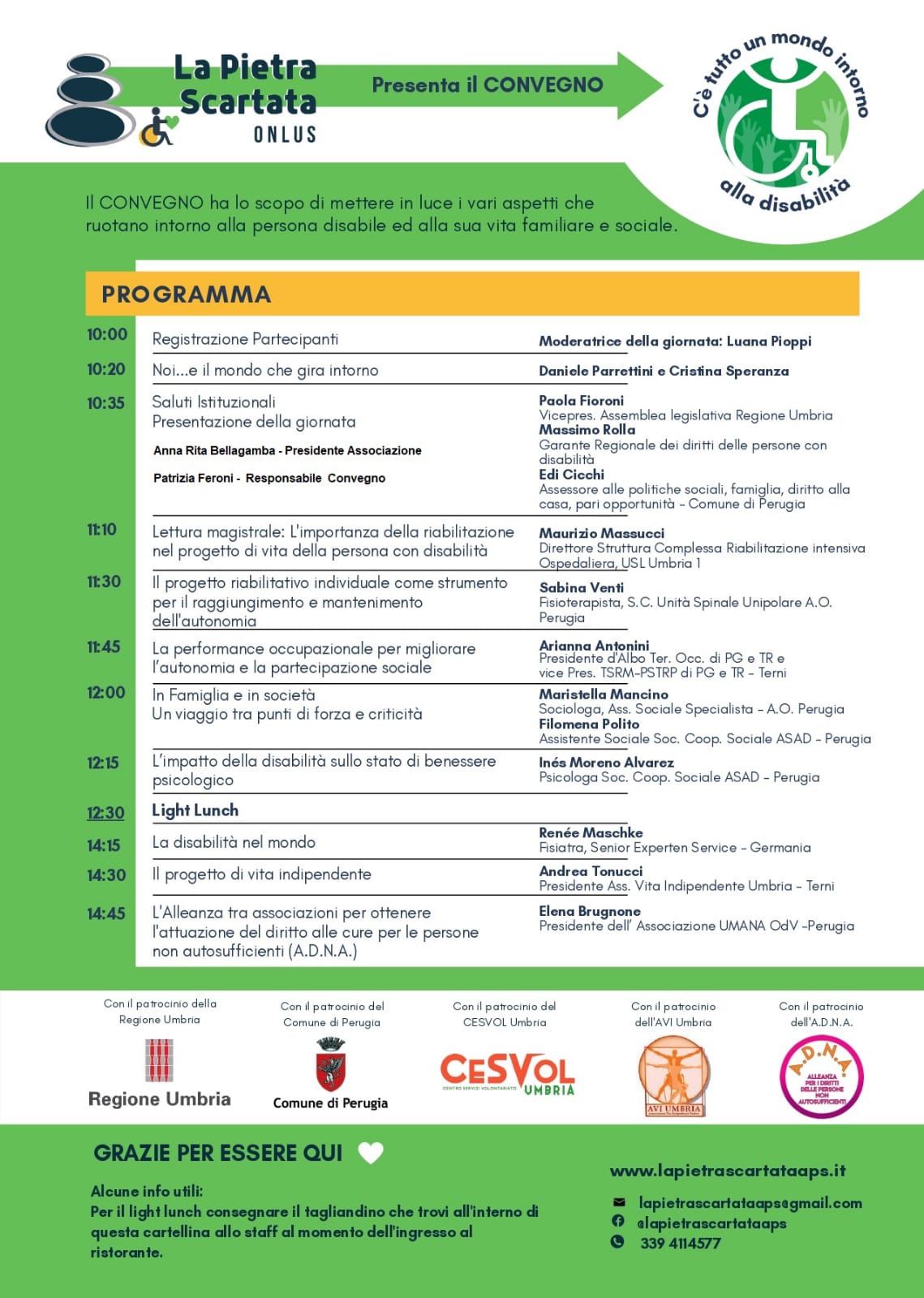 Il convegno si aprirà con una narrazione del titolo “Noi… e il mondo che gira intorno”, a cura del campione umbro di para trap, Daniele Parrettini, e Cristina Speranza. Seguiranno i saluti istituzionali di Paola Fioroni, vice presidente dell’Assemblea Legislativa della Regione Umbria, Massimo Rolla, garante regionale dei diritti delle persone con disabilità, ed Edi Cicchi, assessore alle politiche sociali, famiglia, diritto alla casa, pari opportunità del Comune di Perugia. I lavori si apriranno subito dopo con gli interventi di: Maurizio Massucci, direttore struttura complessa Riabilitazione intensiva ospedaliera Usl Umbria 1, con una lettura magistrale dal titolo “L’importanza della riabilitazione nelle persone con disabilità”; Sabina Venti, fisioterapista Unità spinale unipolare dell’ospedale di Perugia, con “Il progetto riabilitativo come obiettivo per il raggiungimento e mantenimento dell’autonomia”; Arianna Antonini, presidente d’Albo Ter Occ di Perugia e di Terni e vice presidente Ordine dei Tsrm Pstrp Perugia e Terni, con “La performance occupazionale per migliorare l’autonomia e la partecipazione sociale”; Maristella Mancino (sociologa assistente sociale specialista dell’ospedale di Perugia) e Filomena Polito (assistente sociale Soc. Coop. Sociale Asad di Perugia) con “In Famiglia e in società – Un viaggio tra punti di forza e criticità”; Inés Moreno Alvarez, psicologa Soc. Coop. Sociale Asad di Perugia, con “L’impatto della disabilità sullo stato di benessere psicologico”. Nel pomeriggio, invece, interverranno: Renée Maschke, fisiatra e Senior experten service (Germania), con “La disabilità nel mondo”; Andrea Tonucci, presidente associazione Vita Indipendente Umbria (Terni), con “Il progetto di vita indipendente”; Elena Brugnone, presidente dell’associazione Umana OdV di Perugia, con “L’Alleanza tra associazioni per ottenere l’attuazione del diritto alle cure per le persone non autosufficienti (Adna)”. Il convegno ha il patrocinio della Regione Umbria, del Comune di Perugia, del Cesvol Umbria, di Ava Umbria e di Adna.