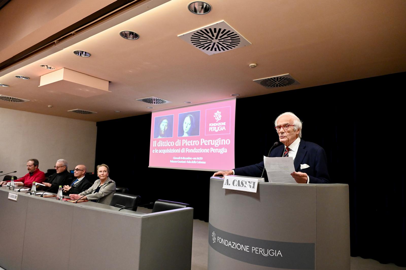 Durante l’incontro sono intervenuti Alcide Casini, Presidente di Fondazione Perugia; Francesco Federico Mancini, storico dell’arte; Antonio Natali, storico dell’arte; Gianluca Poldi dell’Università degli Studi di Udine; Vittoria Garibaldi, storico dell’arte. Gli interventi hanno ricostruito il percorso storico, critico e diagnostico del dittico composto dalle due tavole raffiguranti Cristo coronato di spine e la Vergine, attribuite al Perugino e acquisite all’asta Dorotheum di Vienna del 22 ottobre 2024.