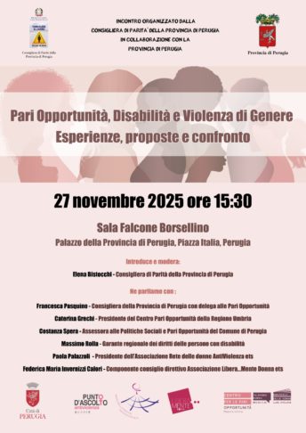 In occasione della Giornata internazionale per l’eliminazione della violenza contro le donne, la Provincia di Perugia, in collaborazione con la consigliera provinciale di Parità, promuove due iniziative rivolte alle scuole del territorio e alla cittadinanza, con l’obiettivo di approfondire il tema della violenza di genere e favorire una riflessione condivisa sulla cultura del rispetto.