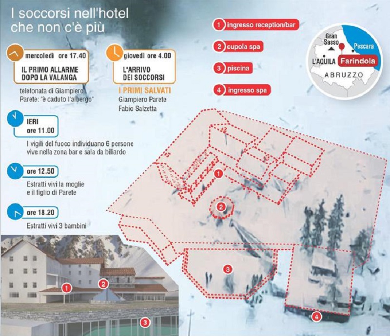 Ancora nessuna notizia di Alessandro Riccetti, il ternano di 33 anni disperso in seguito alla slavina che ha travolto l’hotel Rigopiano dove lavorava come addetto alla reception. Il giovane non figura infatti né tra le persone estratte vive da ciò che rimane della struttura né tra le vittime accertate. La madre e altri familiari continuano quindi a seguire con angoscia l’evolversi della situazione direttamente in Abruzzo dove si sono recati. I congiunti di Riccetti sono assistiti anche da due operatori della protezione civile inviati dal Comune di Terni. Nel frattempo i vigili del fuoco percepiscono altri segnali sotto la neve e le macerie. “Stiamo verificando, potrebbero essere persone vive, ma anche le strutture dell’albergo che si muovono sotto il peso nella neve”, ha spiegato il dirigente Alberto Maiolo al centro operativo di Penne. Undici sopravvissuti, cinque corpi senza vita recuperati e tra i 19 e i 20 dispersi: è questo il bilancio attuale della tragedia dell’hotel Rigopiano.