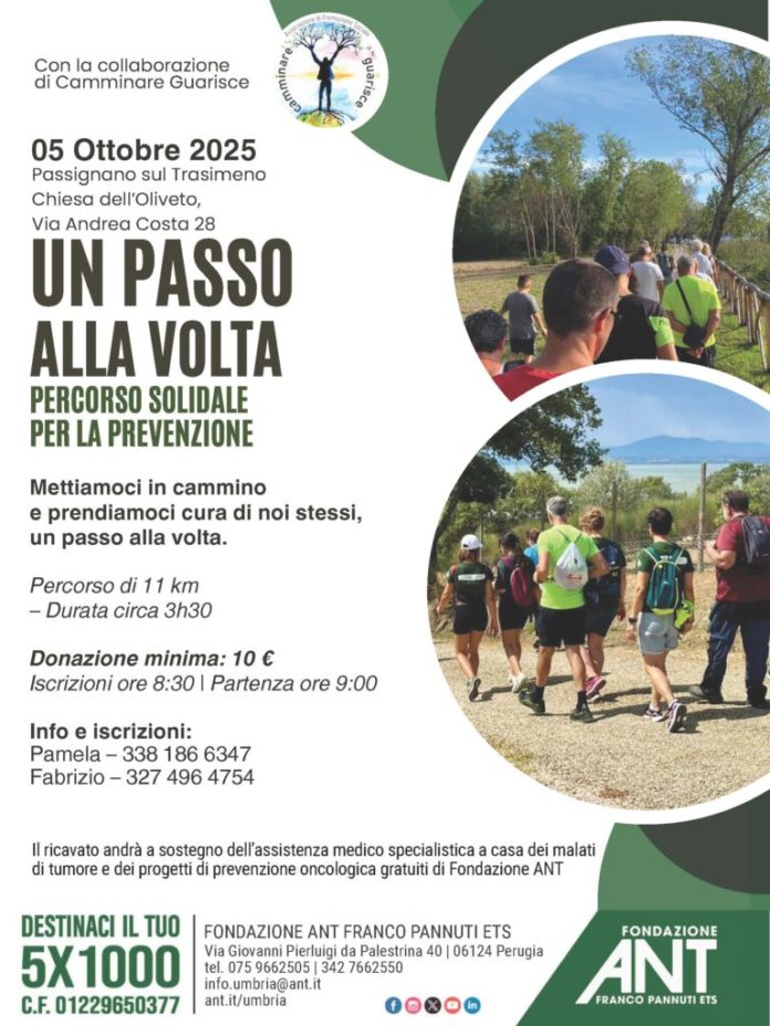 Una mattinata all’insegna della salute e della condivisione. E’ quanto in programma domenica 5 ottobre con “Un passo alla volta – percorso solidale per la prevenzione”, l’iniziativa che unisce attività fisica, benessere e solidarietà, organizzata dalla Fondazione ANT, in collaborazione con l’associazione Camminare Guarisce.