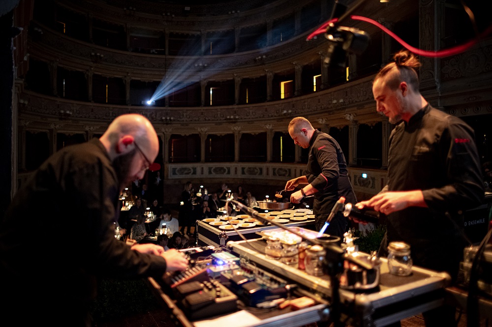 A Spoleto stanno per iniziare quindi quattro giorni di un’esperienza unica, dove attori e spettatori siedono allo stesso tavolo, condividono cibo e musica: concerti e spettacoli da mangiare, cibo e vino da ascoltare e vedere. Questa la forza emozionale e comunicativa dell’evento, in cui lo spazio del teatro viene condiviso interamente, in una chiave di esclusiva convivialità. Gli spettacoli diventano momenti di promozione dei prodotti del territorio e non solo, in una chiave contemporanea.