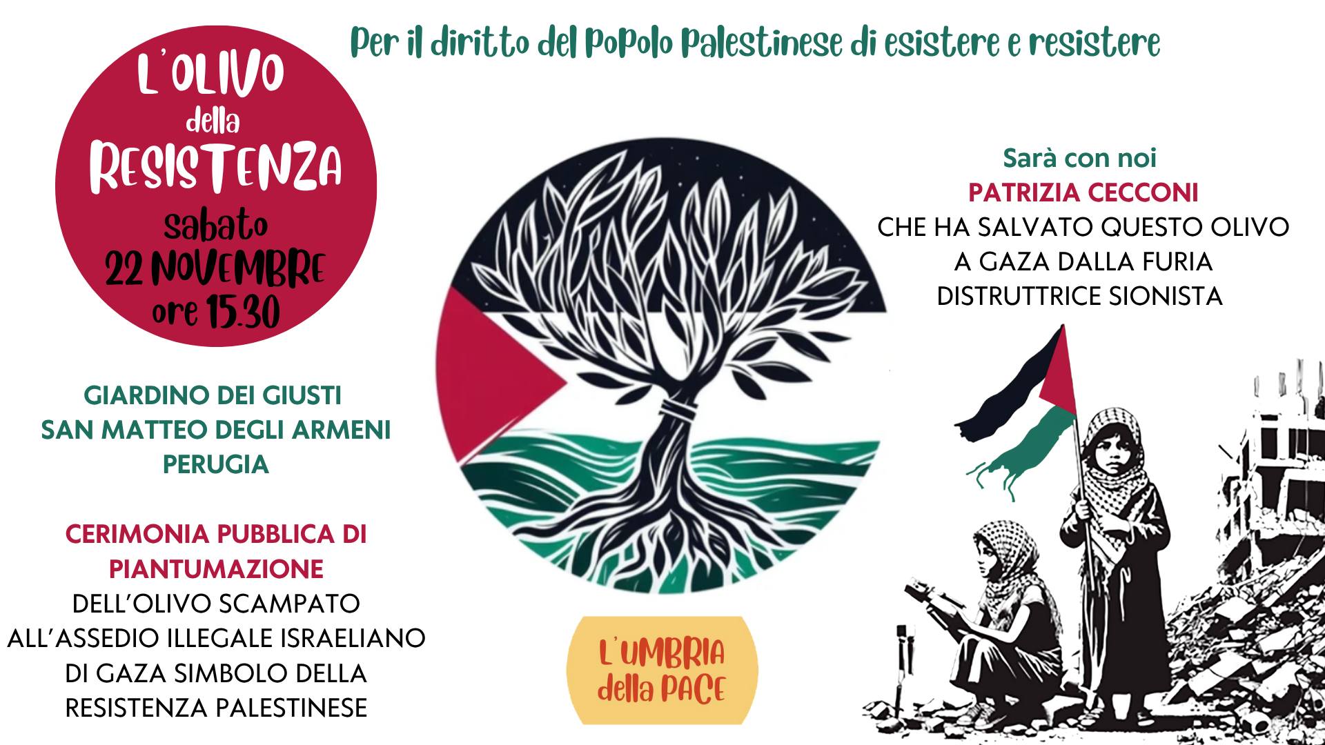 Perugia, 20 nov. – Si terrà sabato 22 novembre alle 15.30 al Giardino dei Giusti alla Biblioteca di San Matteo degli Armeni a Perugia una cerimonia pubblica per la piantumazione dell’‘Olivo della resistenza’, proveniente da Gaza e scampato all’assedio israeliano, portato via in valigia tra mille peripezie da Patrizia Cecconi.