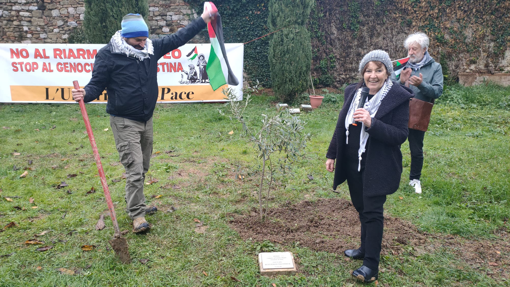“Olivo scampato all’assedio illegale israeliano di Gaza, simbolo della resistenza palestinese. Novembre 2025”. È quanto recita la frase sulla targa apposta alla base dell’ulivo piantumato sabato 22 novembre nel Giardino dei Giusti, alla Biblioteca di San Matteo degli Armeni a Perugia, su iniziativa dell’organizzazione L’Umbria della pace. Si tratta di un olivo proveniente dalla martoriata striscia di Gaza, riportato in valigia alcuni anni fa, tra mille peripezie, da Patrizia Cecconi, attivista da tempo nel campo della tutela dei diritti umani e in particolar modo di diritti violati del popolo palestinese. La cerimonia si è svolta nonostante il maltempo e, oltre alla stessa Cecconi, erano presenti numerosi attivisti e rappresentanti di associazioni. È intervenuto anche l’assessore comunale Fabrizio Croce.