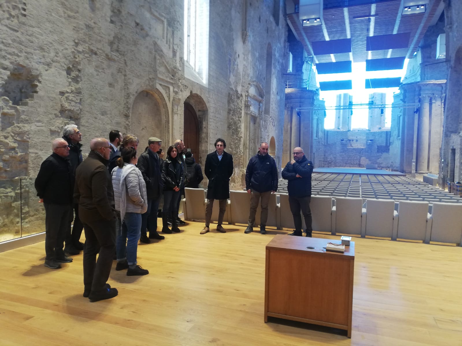 Nel corso della visita che ha ricompreso auditorium, ex cappelle, zona ipogea, camerini e centrale elettrica esterna, Tata ha descritto la progettazione partita nel 2012 e gli interventi eseguiti dal 2016 al 2019 sotto la direzione del Comune, da lui stesso rivestita, finalizzati alla trasformazione della ex chiesa in auditorium attraverso un adattamento dal punto di vista edilizio e acustico (importo complessivo di 4.380.000 euro).
