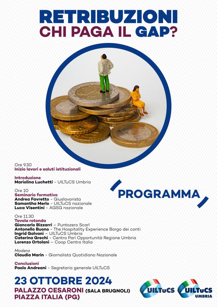 Perugia, 22 ottobre 2024 – Uno spaccato della situazione in Umbria, con dati sull’occupazione e la disparità salariale tra uomo e donna, oltre che testimonianze di lavoratori e datori di lavoro. Tutto questo sarà presentato nel convegno organizzato da Uiltucs Umbria dal titolo ‘Retribuzioni – chi paga il gap?’, in programma domani, mercoledì 23 ottobre, a partire dalle 9.30, presso la Sala Brugnoli di Palazzo Cesaroni.