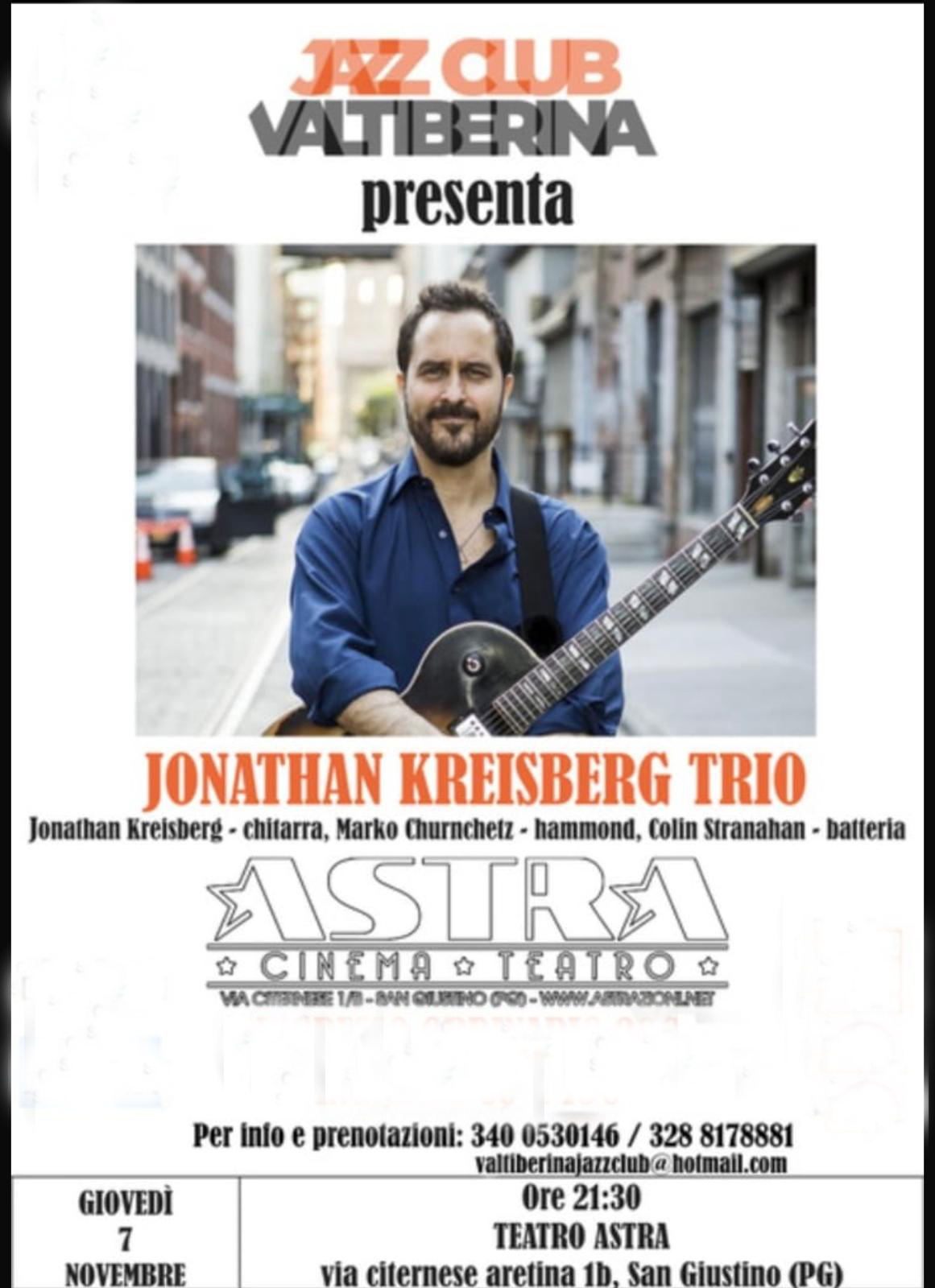 (Cittadino e Provincia) – San Giustino, 5 novembre ‘24 – Una serata imperdibile all’insegna del grande jazz con il Jonathan Kreisberg Trio. E’ quanto andrà in scena nella suggestiva cornice del cinema teatro Astra di San Giustino giovedì 7 novembre, a partire dalle ore 21.
