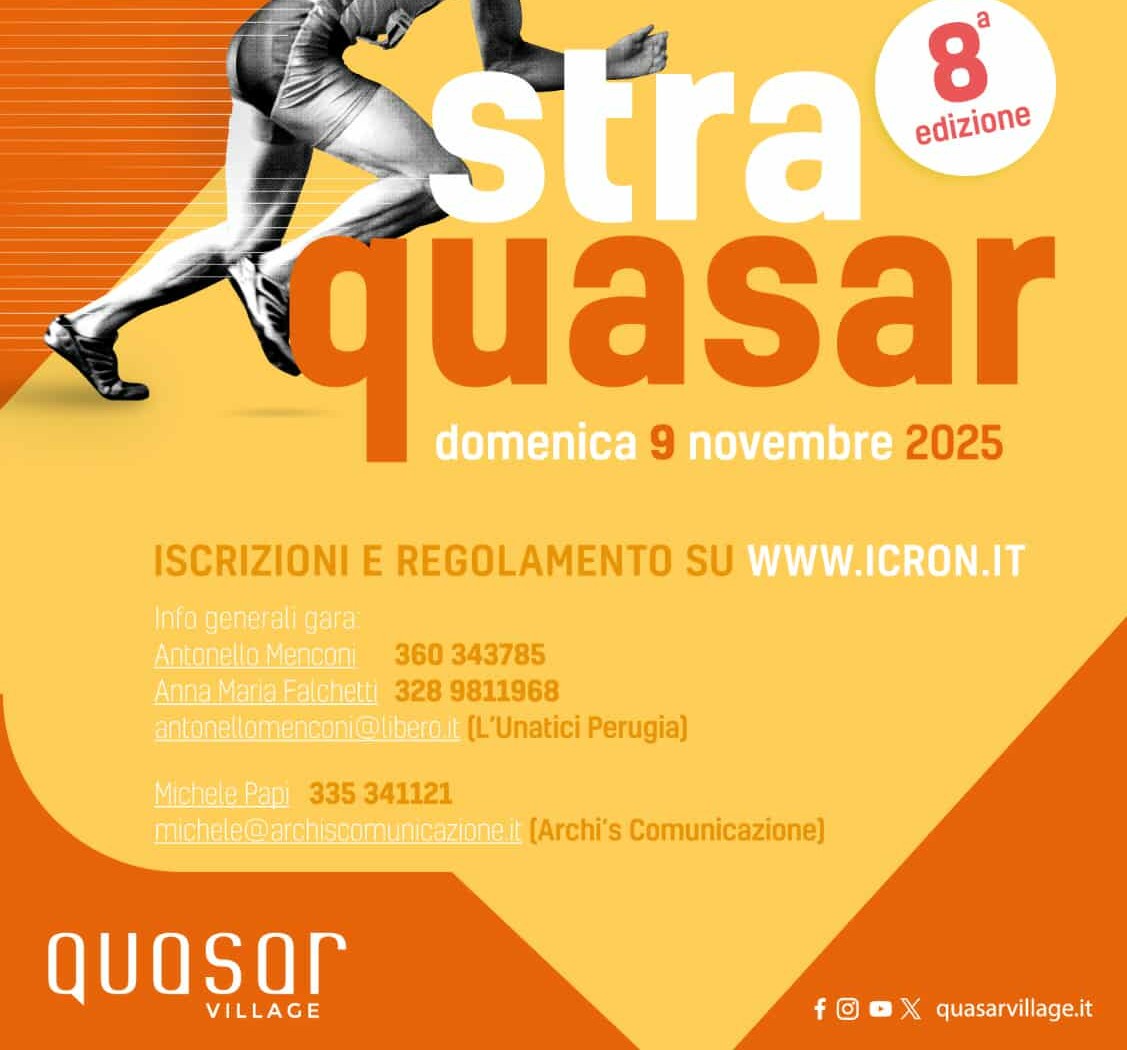 Sono aperte le iscrizioni alla prossima edizione della Straquasar, in programma domenica 9 novembre nel territorio corcianese con partenza ed arrivo al Quasar Village. La gara podistica è diventata ormai una delle classiche degli ultimi anni del calendario umbro, coinvolgendo anche tanti atleti delle regioni limitrofe, essendo tappa sia del circuito Avis umbro toscano e di quello regionale dei Borghi più belli d’Italia. Il percorso che attraverserà una parte del paese di Solomeo, lungo un tracciato che sarà all’incirca di 10 chilometri e mezzo.