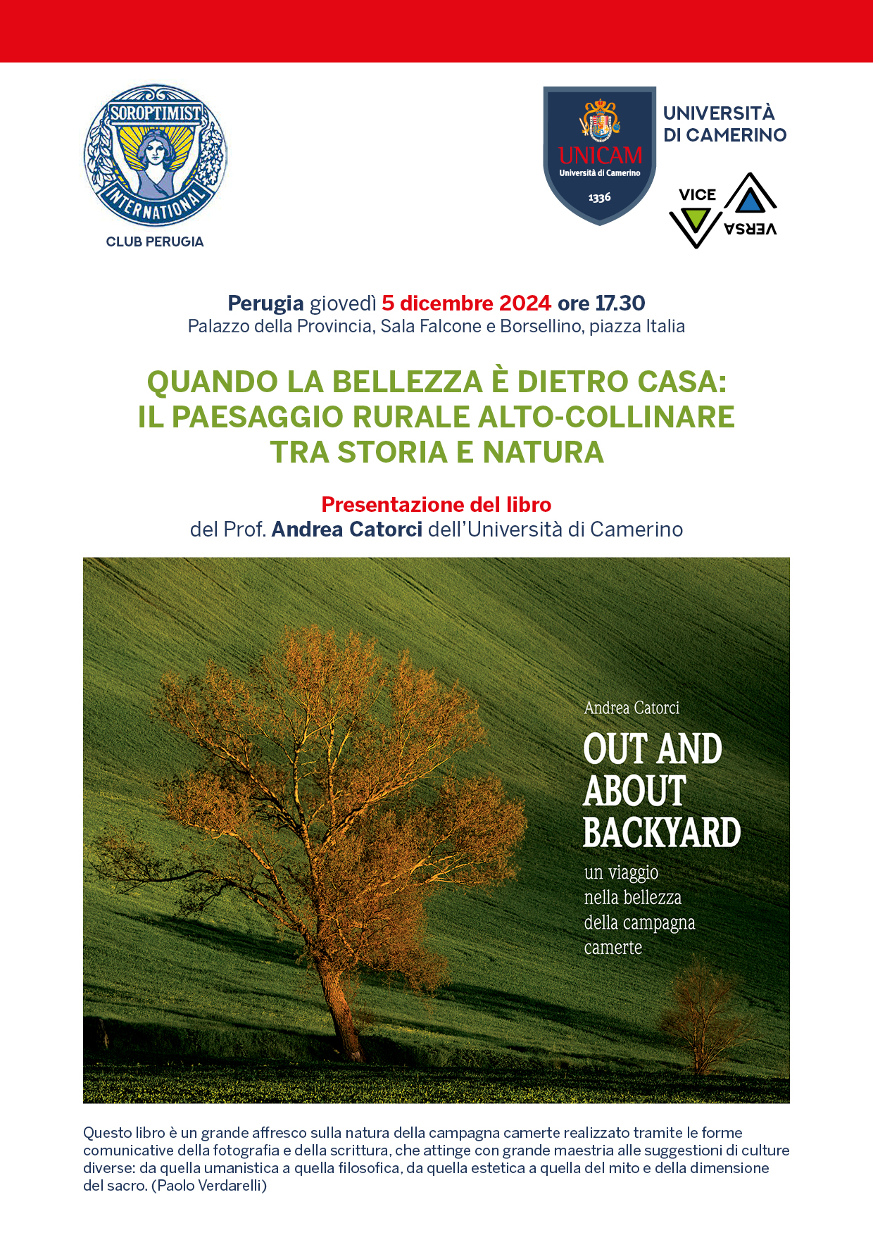Nell’ambito delle attività finalizzate alla valorizzazione del territorio ed alla tutela dell’ambiente, il Soroptimist International Club Perugia organizza giovedì 5 dicembre la presentazione del libro fotografico “Out and about backyard: un viaggio nella bellezza della campagna camerte”, ideato e scritto dal Prof. Andrea Catorci, botanico ed ecologo vegetale presso la Scuola di Bioscienze e Medicina Veterinaria dell’Università degli Studi di Camerino, nonché membro della Associazione Fotografi Naturalisti Italiani e del Circolo Fotografico Camerte Progetto Immagine.